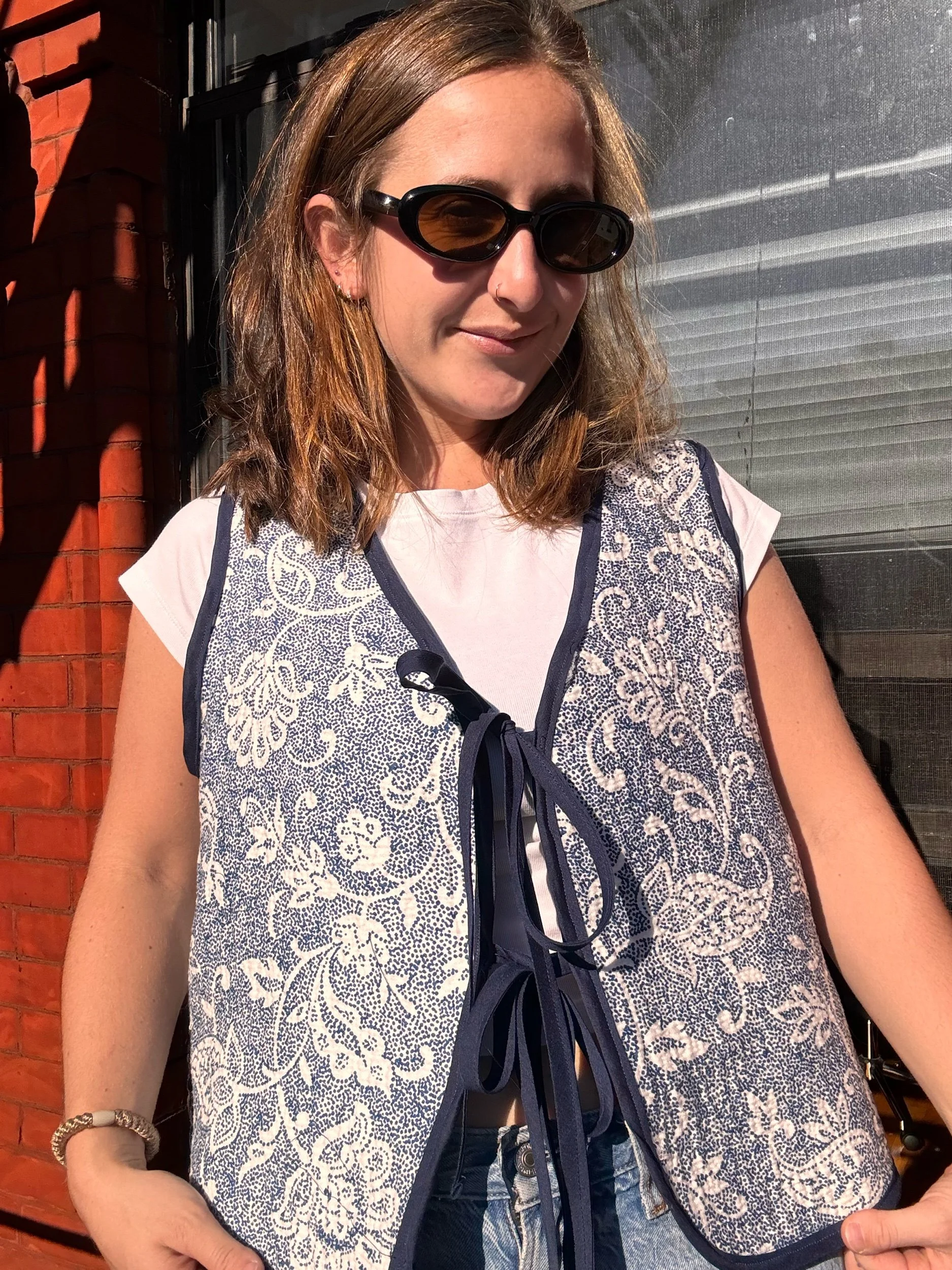 Image 1 of 4 Image 2 of 4 Image 3 of 4 Image 4 of 4 Reversible vest $80.00 Reversible blue and yellow vestWith ribbon ties Hand sewn π Add To Cart Added! Reversible blue and yellow vestWith ribbon ties Hand sewn π